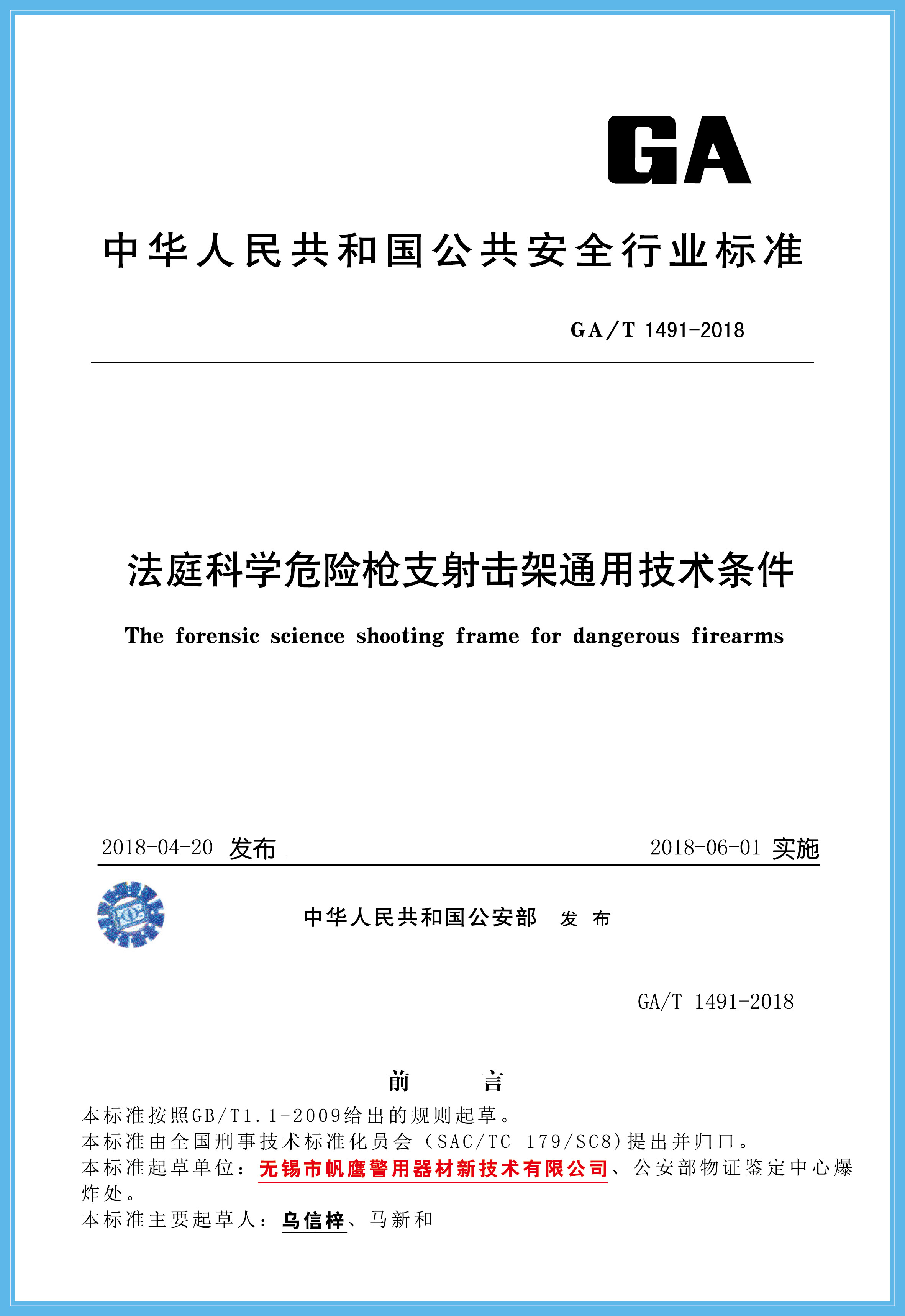 無錫市帆鷹警用器材新技術(shù)有限公司起草了11項行業(yè)標(biāo)準(zhǔn),目前公安部已審核通過10項,此次通過的3項為2018年度公安部新列標(biāo)準(zhǔn),已報國家質(zhì)量監(jiān)督檢驗檢疫總局備案,通過的3項標(biāo)準(zhǔn)為:法醫(yī)科學(xué)槍彈測速儀通用技術(shù)條件(GA/T 1488-2018)、法醫(yī)電動開顱鋸?fù)ㄓ眉夹g(shù)條件(GA/T 1489-2018)、法醫(yī)科學(xué)危險槍支射擊架通用技術(shù)條件,現(xiàn)特予以公告。